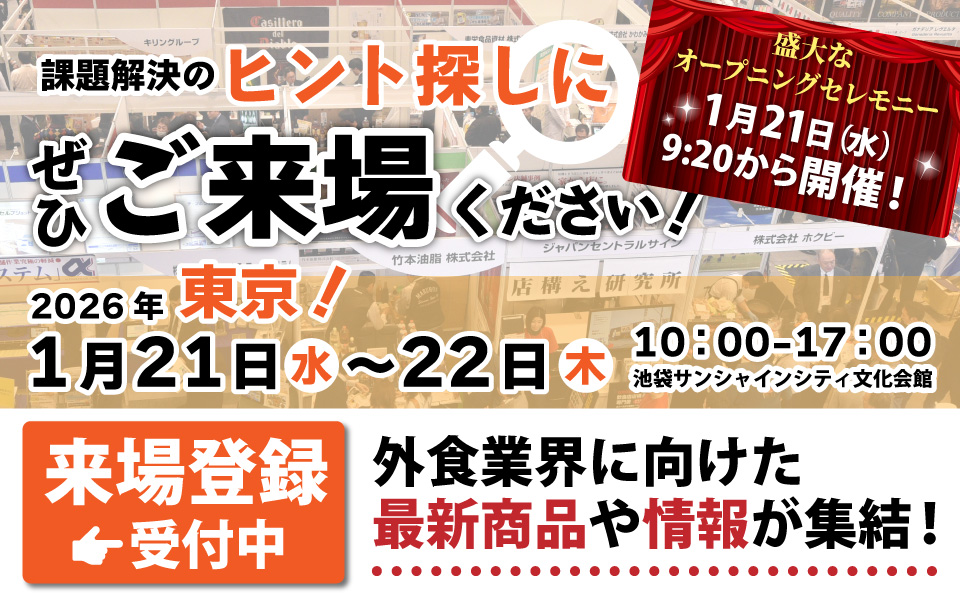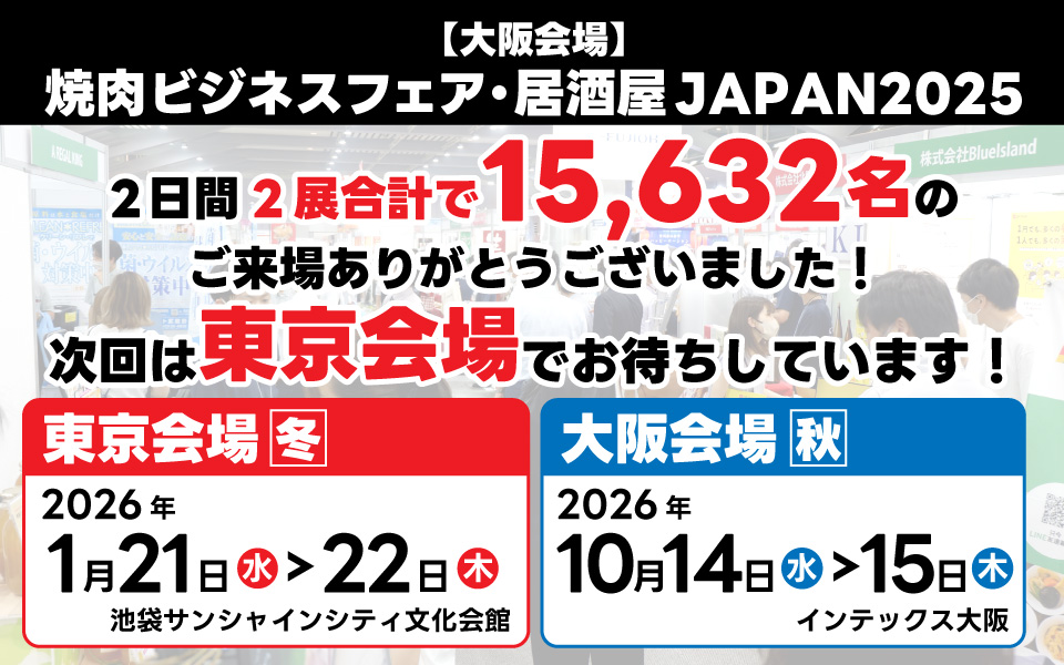 index 2023.11.212025.11.12 主催:焼肉ビジネスフェア実行委員会/居酒屋JAPAN実行委員会 合同開催!相互入場可能! 合同開催!相互入場可能! 大阪会場 来場のご案内(インテックス大阪) 大阪/出展社一覧 PRプラン 出展できない企業様も使用できるプランもございます! 開催動画を見る 焼肉ビジネスフェア/居酒屋JAPAN 2025 in 東京 〜飲食店様向けビジネスショー〜 焼肉ビジネスフェア/居酒屋JAPAN 2024 in 大阪 〜飲食店様向けビジネスショー〜 新着情報 焼肉ビジネスフェア・居酒屋JAPAN2025大阪会場 出展社一覧を公開いたしました! 2025.11.13 焼肉ビジネスフェア・居酒屋JAPAN2025 大阪会場 開会式ご登壇者決定いたしました! 2025.10.16 焼肉ビジネスフェア&居酒屋JAPAN2025 大阪会場 セミナー登壇者決定しました! 2025.10.16 2025年11月大阪会場開催 事前来場登録開始いたしました! 2025.10.14 焼肉ビジネスフェア・居酒屋JAPAN2025 東京会場 来場者数速報 2025.01.23 SNS リンクについて 焼肉ビジネスフェア関連サイト 居酒屋JAPAN関連サイト 外食ソリューションEXPO 関連サイト その他の関連サイト一覧