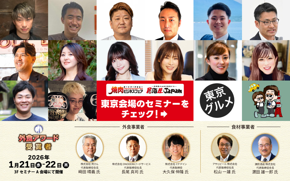 index 2023.11.212025.12.23 主催:焼肉ビジネスフェア実行委員会/居酒屋JAPAN実行委員会 合同開催!相互入場可能! 東京会場 来場のご案内(池袋サンシャインシティ文化会館) 東京/出展社一覧 PRプラン 出展できない企業様も使用できるプランもございます! 開催動画を見る 焼肉ビジネスフェア/居酒屋JAPAN 2025 in 東京 〜飲食店様向けビジネスショー〜 焼肉ビジネスフェア/居酒屋JAPAN 2024 in 大阪 〜飲食店様向けビジネスショー〜 新着情報 焼肉ビジネスフェア・居酒屋JAPAN2026東京会場 出展社一覧を公開いたしました! 2025.12.23 焼肉ビジネスフェア・居酒屋JAPAN2026 東京会場 開会式ご登壇者決定いたしました! 2025.12.18 焼肉ビジネスフェア&居酒屋JAPAN2026 東京会場 セミナー登壇者決定しました! 2025.12.18 2026年1月東京会場開催 事前来場登録開始いたしました! 2025.12.03 焼肉ビジネスフェア・居酒屋JAPAN2025 大阪会場来場者数速報 2025.11.27 SNS リンクについて 焼肉ビジネスフェア関連サイト 居酒屋JAPAN関連サイト 外食ソリューションEXPO 関連サイト その他の関連サイト一覧