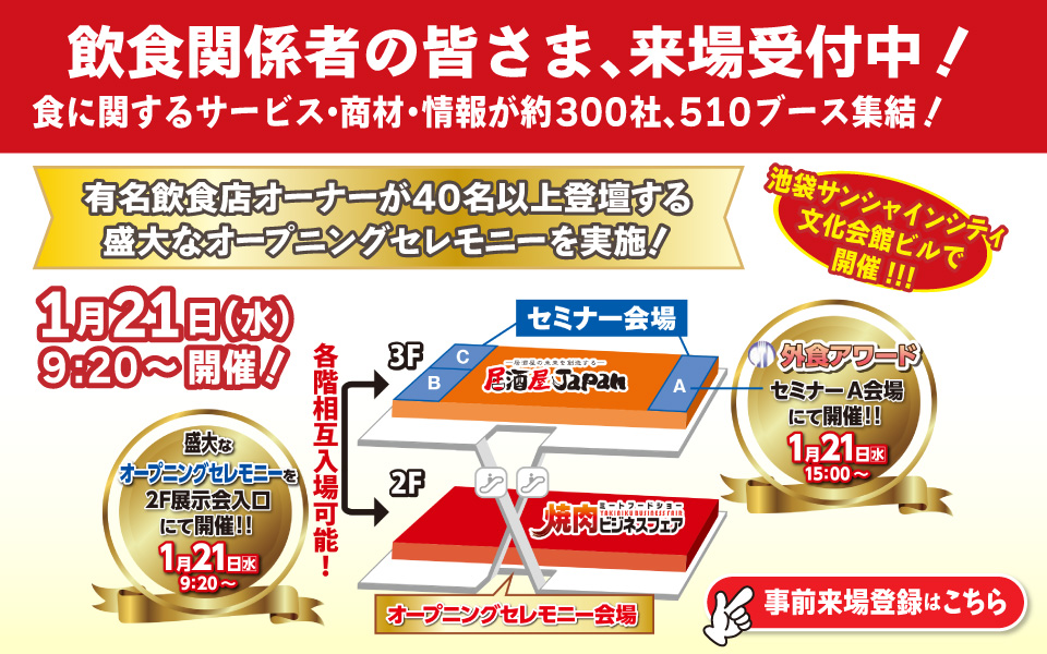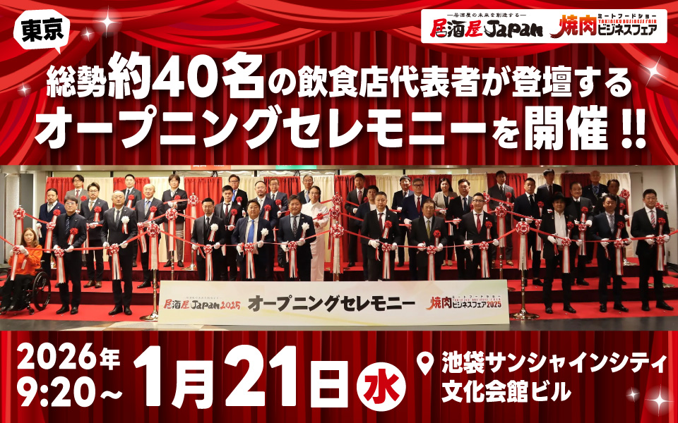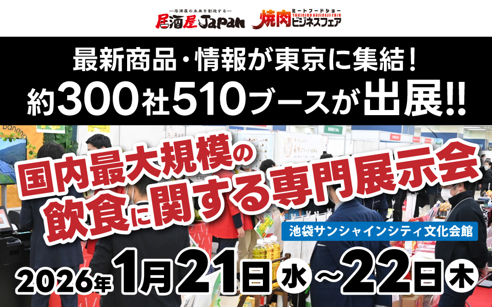 index 2023.11.212025.12.23 主催:焼肉ビジネスフェア実行委員会/居酒屋JAPAN実行委員会 合同開催!相互入場可能! 東京会場 来場のご案内(池袋サンシャインシティ文化会館) 東京/出展社一覧 PRプラン 出展できない企業様も使用できるプランもございます! 開催動画を見る 焼肉ビジネスフェア/居酒屋JAPAN 2025 in 東京 〜飲食店様向けビジネスショー〜 焼肉ビジネスフェア/居酒屋JAPAN 2024 in 大阪 〜飲食店様向けビジネスショー〜 新着情報 焼肉ビジネスフェア・居酒屋JAPAN2026東京会場 出展社一覧を公開いたしました! 2025.12.23 焼肉ビジネスフェア・居酒屋JAPAN2026 東京会場 開会式ご登壇者決定いたしました! 2025.12.18 焼肉ビジネスフェア&居酒屋JAPAN2026 東京会場 セミナー登壇者決定しました! 2025.12.18 2026年1月東京会場開催 事前来場登録開始いたしました! 2025.12.03 焼肉ビジネスフェア・居酒屋JAPAN2025 大阪会場来場者数速報 2025.11.27 SNS リンクについて 焼肉ビジネスフェア関連サイト 居酒屋JAPAN関連サイト 外食ソリューションEXPO 関連サイト その他の関連サイト一覧