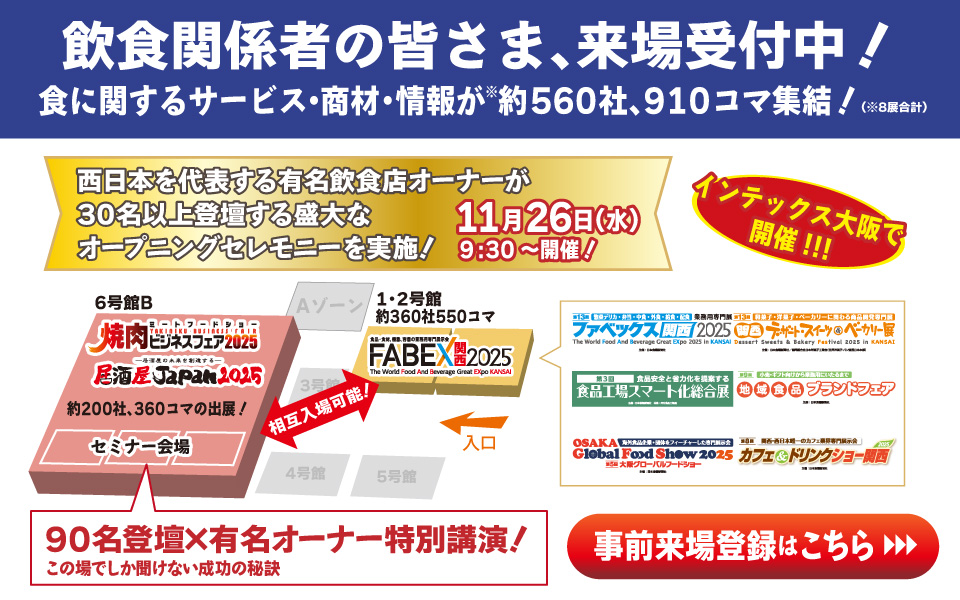 index 2023.11.212025.11.12 主催:焼肉ビジネスフェア実行委員会/居酒屋JAPAN実行委員会 合同開催!相互入場可能! 合同開催!相互入場可能! 大阪会場 来場のご案内(インテックス大阪) 大阪/出展社一覧 PRプラン 出展できない企業様も使用できるプランもございます! 開催動画を見る 焼肉ビジネスフェア/居酒屋JAPAN 2025 in 東京 〜飲食店様向けビジネスショー〜 焼肉ビジネスフェア/居酒屋JAPAN 2024 in 大阪 〜飲食店様向けビジネスショー〜 新着情報 焼肉ビジネスフェア・居酒屋JAPAN2025大阪会場 出展社一覧を公開いたしました! 2025.11.13 焼肉ビジネスフェア・居酒屋JAPAN2025 大阪会場 開会式ご登壇者決定いたしました! 2025.10.16 焼肉ビジネスフェア&居酒屋JAPAN2025 大阪会場 セミナー登壇者決定しました! 2025.10.16 2025年11月大阪会場開催 事前来場登録開始いたしました! 2025.10.14 焼肉ビジネスフェア・居酒屋JAPAN2025 東京会場 来場者数速報 2025.01.23 SNS リンクについて 焼肉ビジネスフェア関連サイト 居酒屋JAPAN関連サイト 外食ソリューションEXPO 関連サイト その他の関連サイト一覧